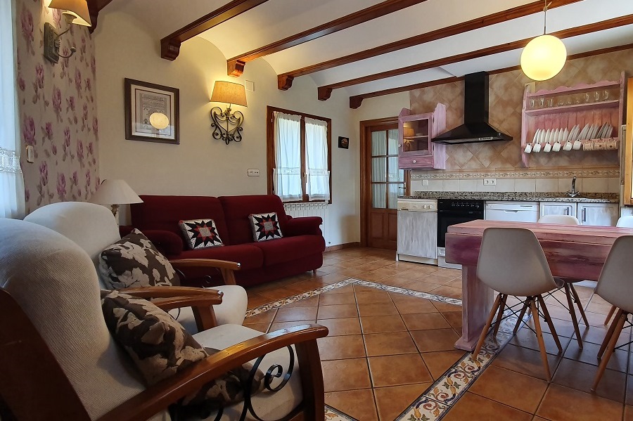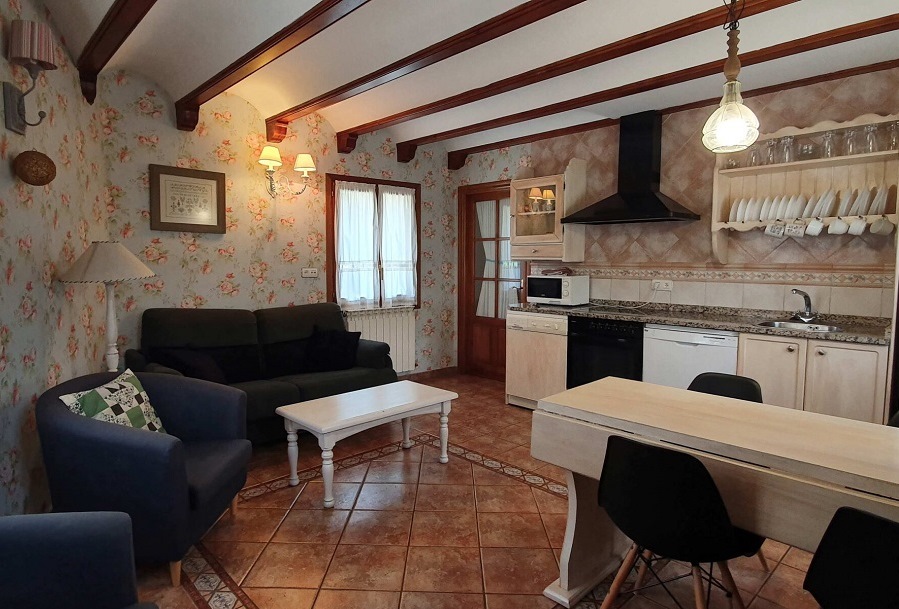 Los apartamentos son dúplex, tienen tres dormitorios y están distribuidos en dos plantas: en la primera tenemos una habitación doble con cama nido y un salón cocina totalmente equipada. La segunda planta es abuardillada y tiene otros dos dormitorios, uno de matrimonio y otro doble como el de abajo con cama nido y baño con ducha. Tienen calefacción central.