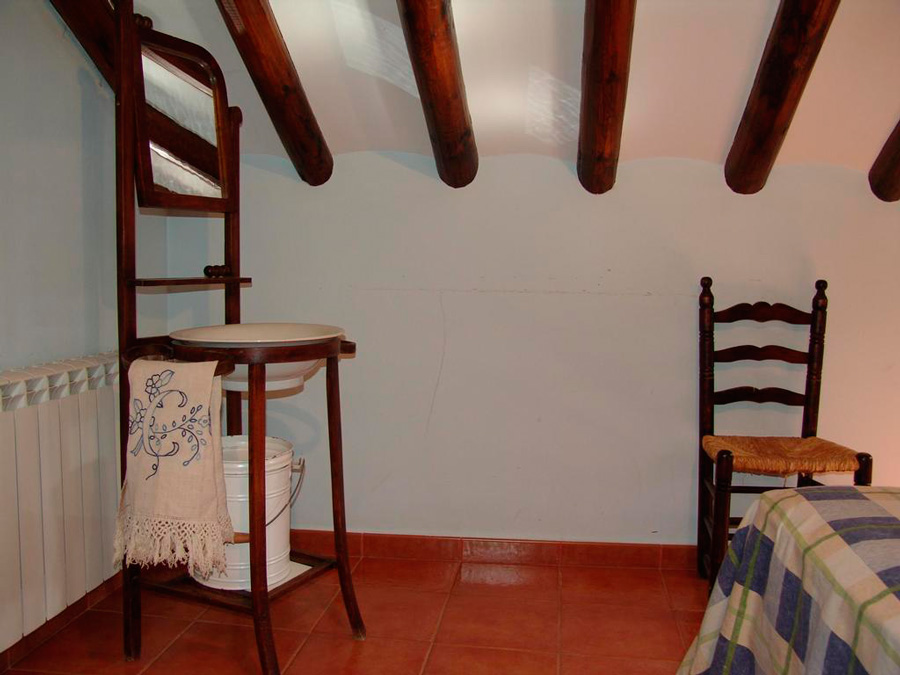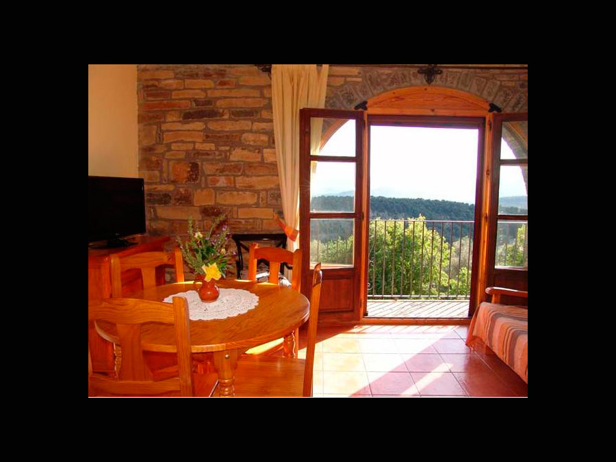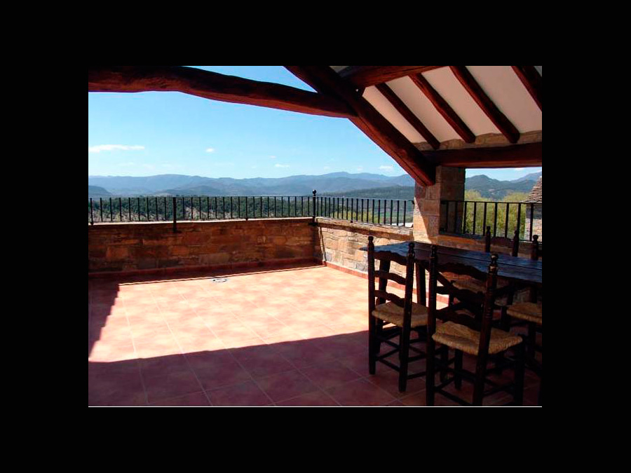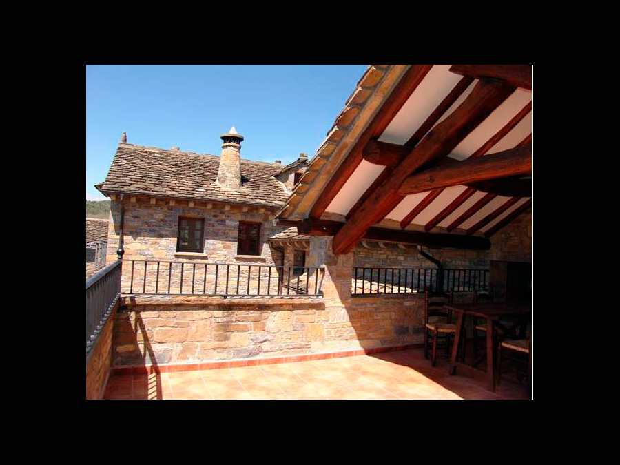 Este apartamento se distingue de los demás por su amplia terraza a la que se accede directamente desde el comedor. Una parte de la misma está cubierta a doble vertiente con un tejado tradicional de vigas de madera y teja de losa. Dispone de mesa con sillas para poder comer fuera incluso si llueve. La terraza tiene una magnífica vista del valle y está bien orientada.