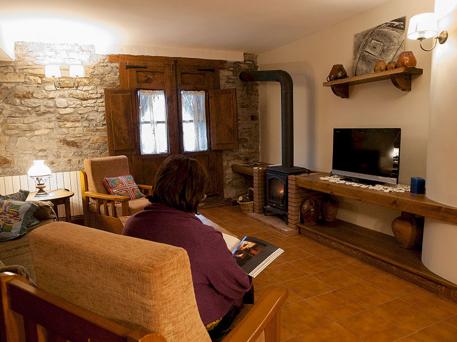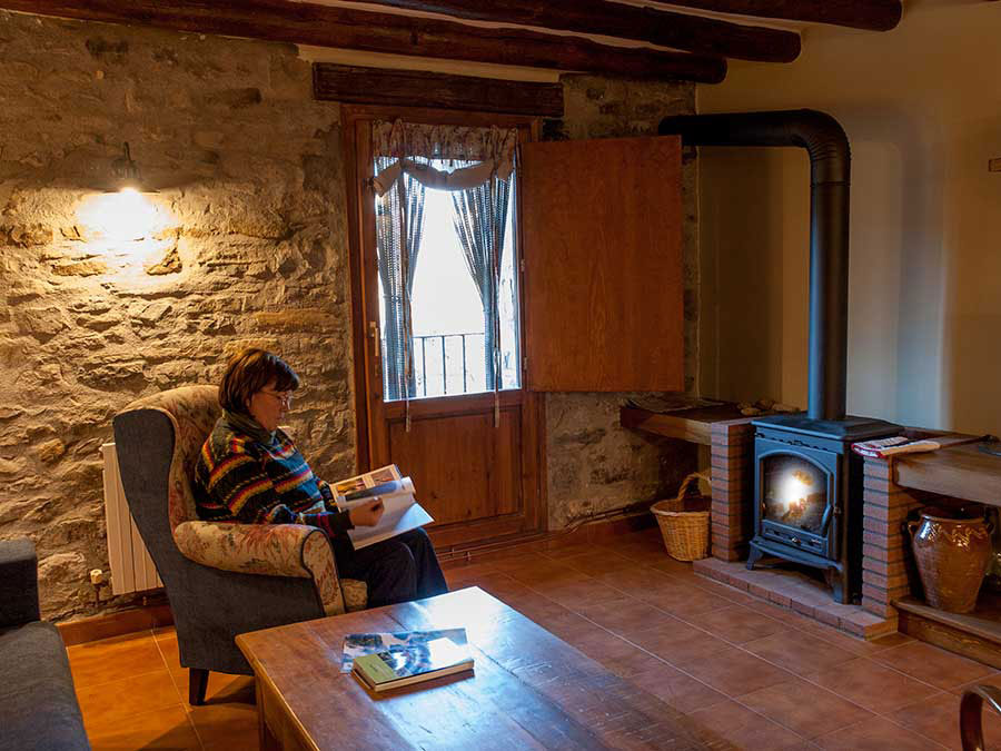 La chimenea del salón y sirve de apoyo como fuego de compañía. Apagar la televisión y ojear un libro plácidamente invita a dormirse, sin ruidos. Todo un placer.