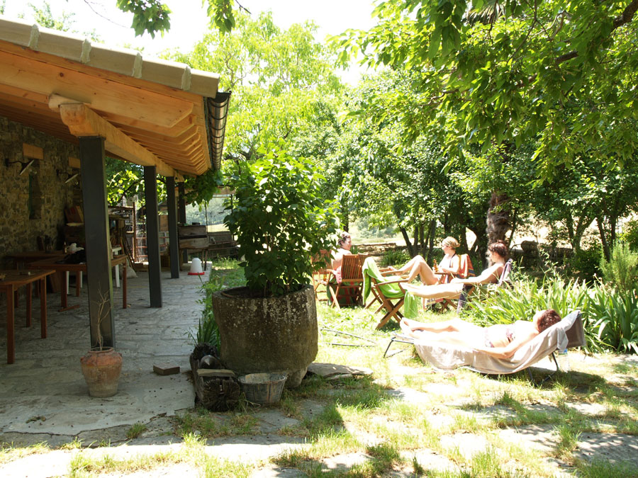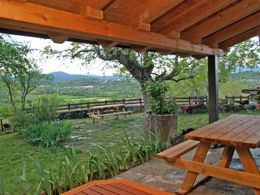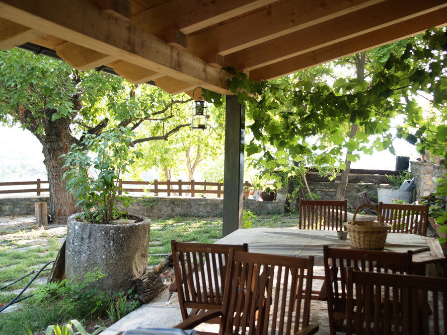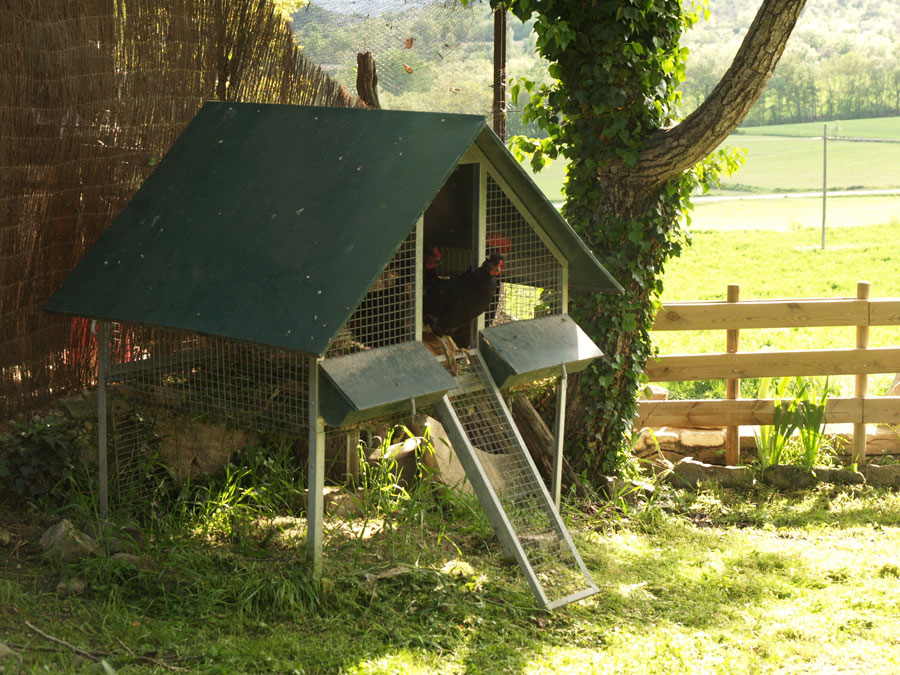 El jardín está por la parte de atrás de la casa. Tiene un buen porche con mesas de pic-nic, barbacoa, columpios, y muy cerca , las gallinas que no se pierden detalle. De vez en cuando, circula algún gato cariñoso por las cercanías.