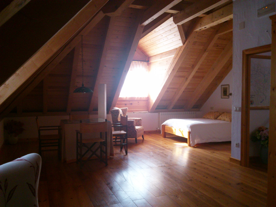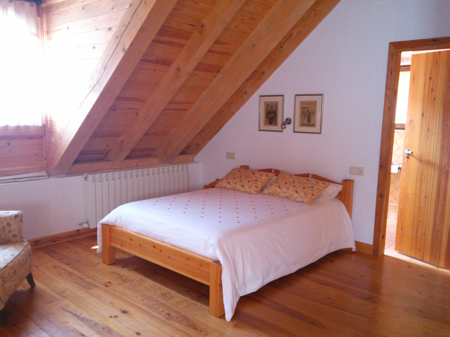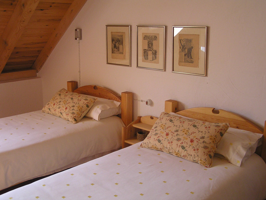 En la segunda planta, bajo cubierta, están las otras dos habitaciones, una de ellas con dos plazas individuales, y la habitación familiar de 45 m2 , con cama de matrimonio y 2 camas individuales, armario y mesa familiar, con 2 ventanas abuhardilladas.