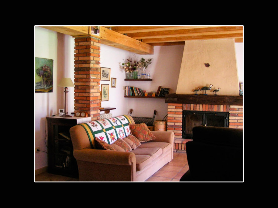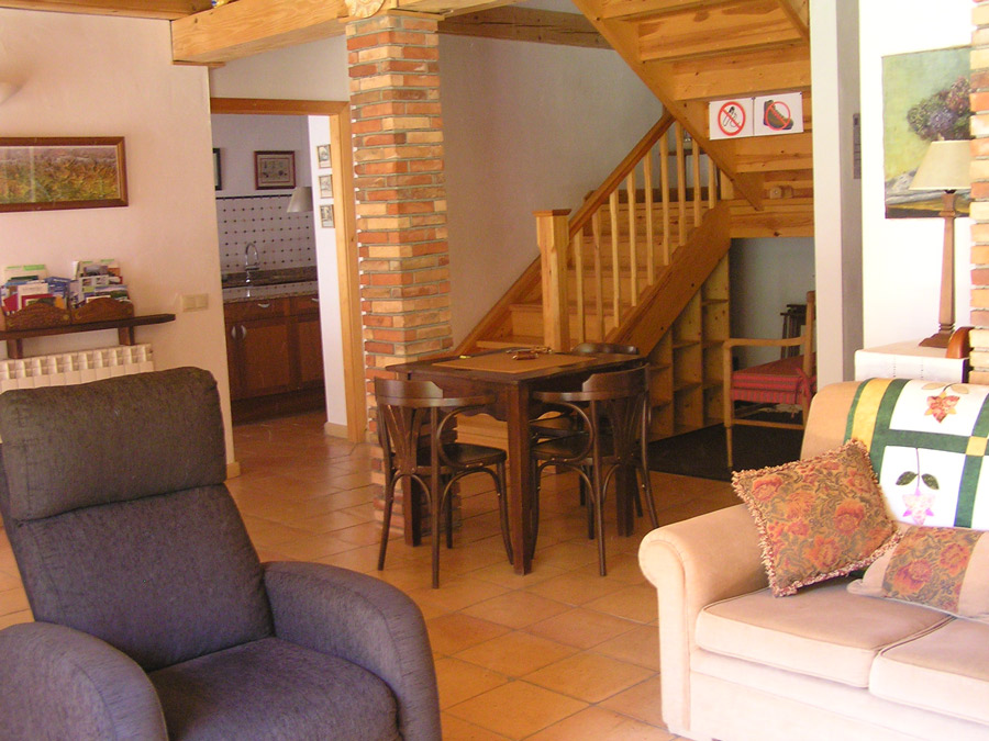 La sala de estar de casi 30m2, dispone de una mesa de juegos y un espacio con sofá y 3 sillones individuales y un ventanal con una puerta que da acceso al jardín.