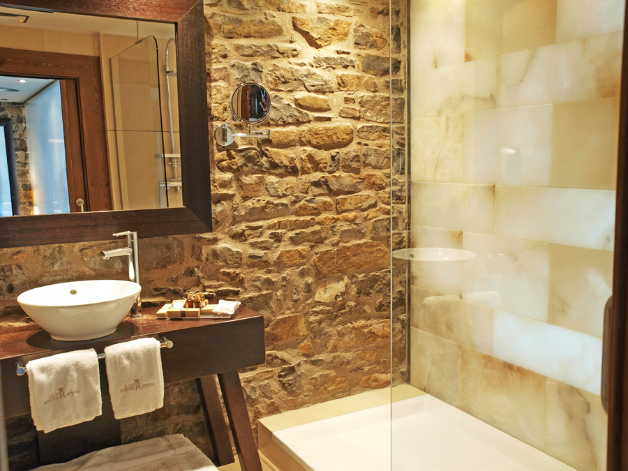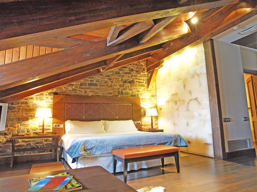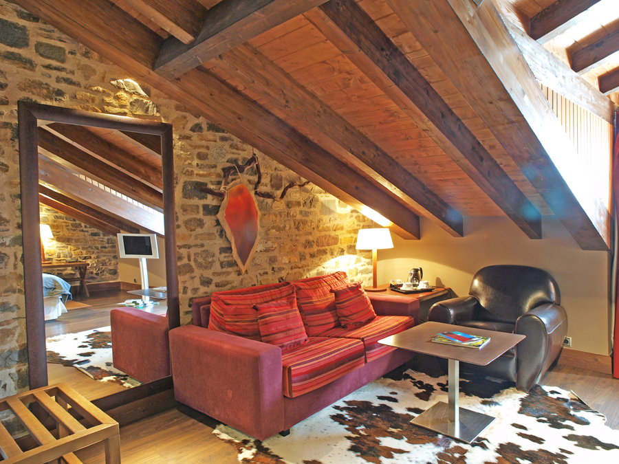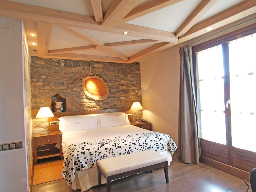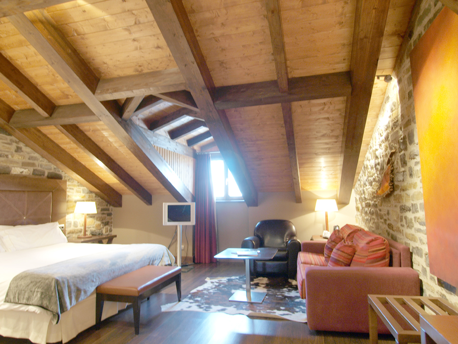 Habitación Júnior suite, de 35 metros, situada en la primera planta, con vistas a la plaza medieval de Aínsa. Dispone de 2 compartimentos habitables, hall y alcoba, y un baño que recibe luz natural debido a la pared frontal de la ducha elaborada en alabastro.