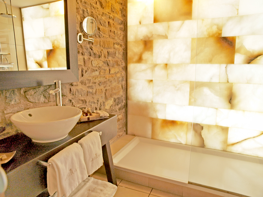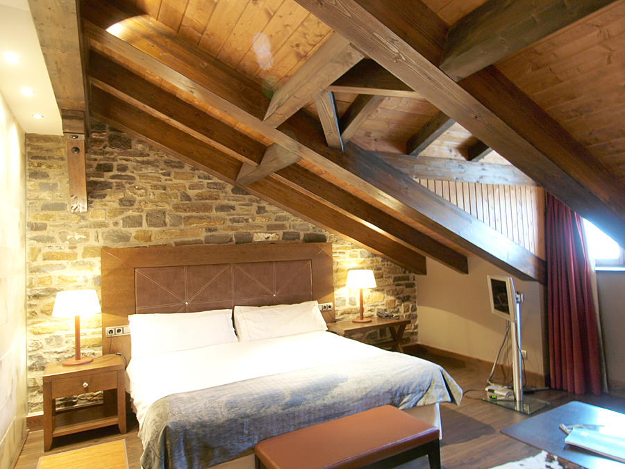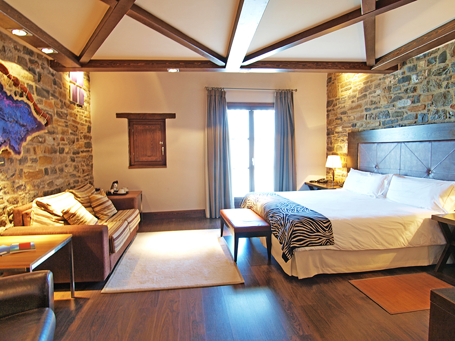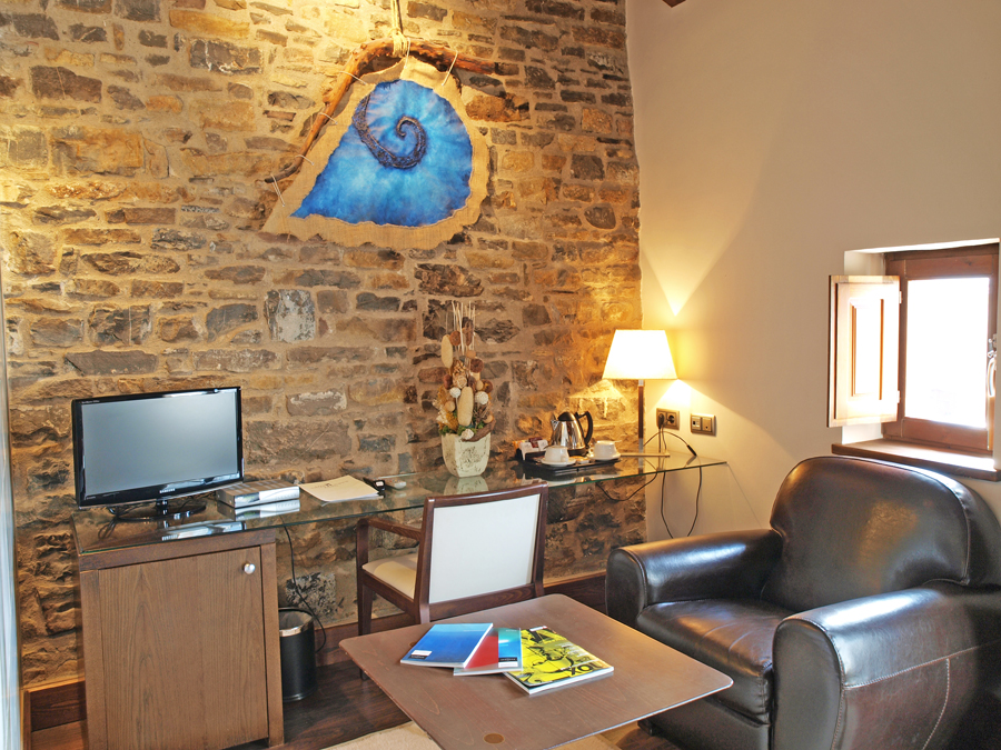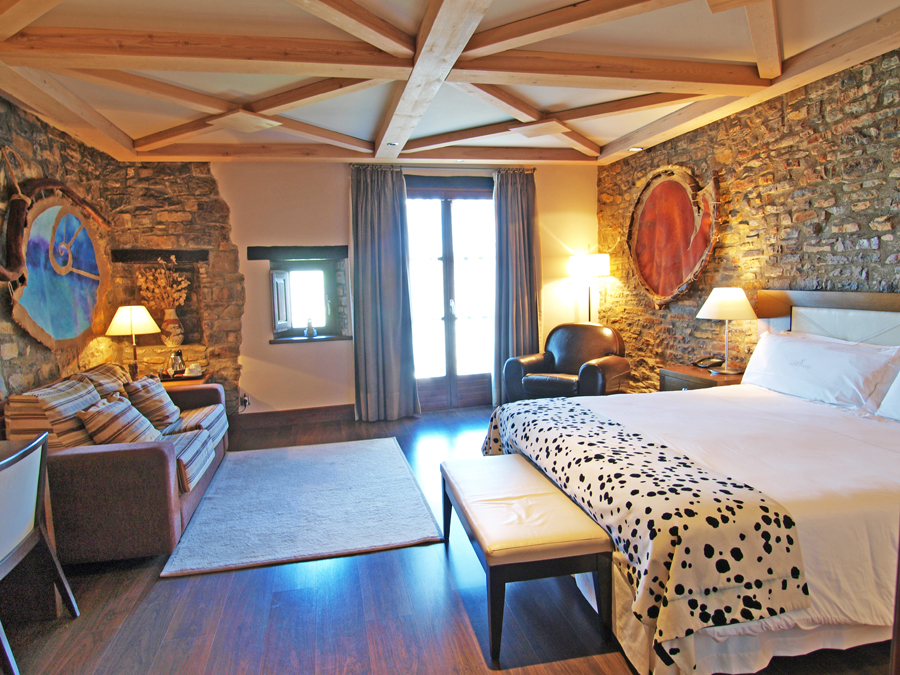 Habitación Júnior suite, de 35 metros, situada en la primera planta, con vistas a la plaza medieval de Aínsa. Dispone de 2 compartimentos habitables, hall y alcoba, y un baño que recibe luz natural debido a la pared frontal de la ducha elaborada en alabastro.