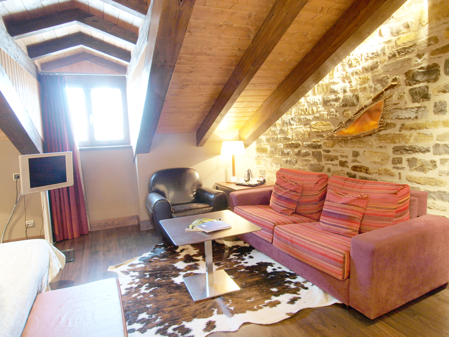 Habitación Júnior suite, de 40 metros, situada en la 1º planta, con inmejorables vistas al Pirineo. Cuenta con dos estancias, el hall con armario ropero y la alcoba con una amplia cama de (2x2m) y un cómodo sofá de dos plazas transformable en cama de colchón látex.