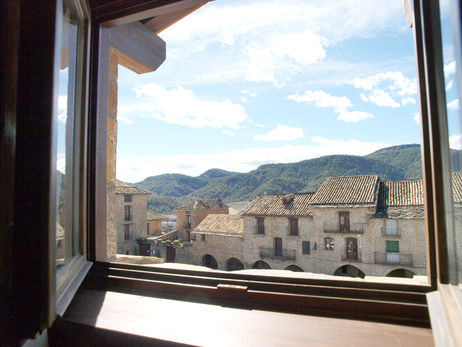 Júnior Suite, de 30 metros habitables, con hall, situada en la 2ª planta. Con balcón y ventanuco con vistas a la plaza medieval de Aínsa.