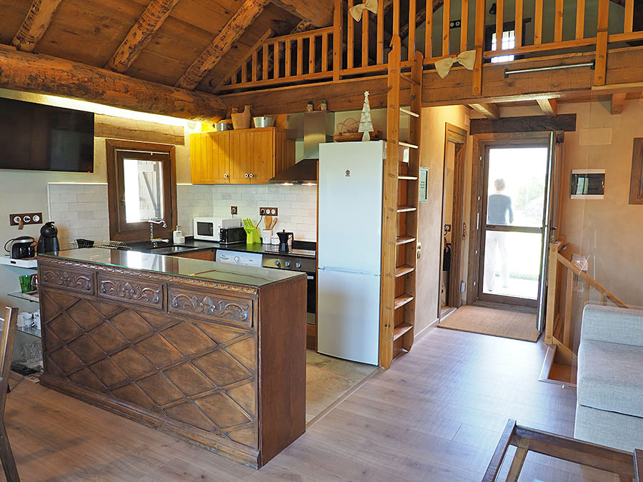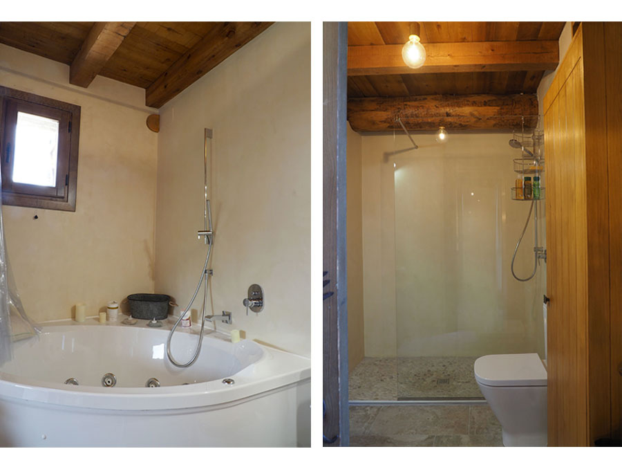 Planta baja: 1 habitación con cama de 180x200cm con un baño equipado con una gran bañera excavada en el suelo con cascada de agua. 1 habitación con dos camas (dos camas de 90x200cm) y baño completo con ducha.