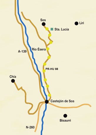 Se accede a través de la calle Luchón de Castejón de Sos, seguimos por el camino contiguo. En la primera bifurcación del mismo se toma el de la derecha hasta llegar al Prau Ral (donde se encuentra el campo de aterrizaje de parapente), cogiendo el camino de la derecha pegado a la borda Farrero hasta llegar al barranco de Liri. Este tramo es impresionante por la cobertura arbórea que posee: avellanos y boj se entrelazan formando un tunel. Cruzando el barranco, continuando por el camino de Sos, accedemos a un tramo del mismo por pista, unos m. a la izquierda de la pista, retomamos en desviación a la derecha continuamos por el camino de Sos, dejando a la derecha una borda cercana… finalmente llegamos a Sos, accediendo al mismo por las laderas de la montaña en la que se enclava la iglesia del pueblo.